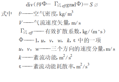 從流動的雷諾數(shù)來考慮, 潔凈車間的氣流均為紊流[ 1] , 空氣的流動滿足連續(xù)性方程、動量方程和能量方程。對于工程問題, 我們不需要關(guān)心紊流的精細結(jié)構(gòu)及其瞬時變化, 而只關(guān)心紊流隨機變量的有關(guān)平均值, 因此, 本文采用雷諾時均方程紊流粘性系數(shù)法, 流動模型采用暖通空調(diào)廣泛采用的標準k -ε二方程模型, k -ε模型通過求解紊流動能與紊流動能耗散率的輸運方程得到紊流粘性系數(shù)。